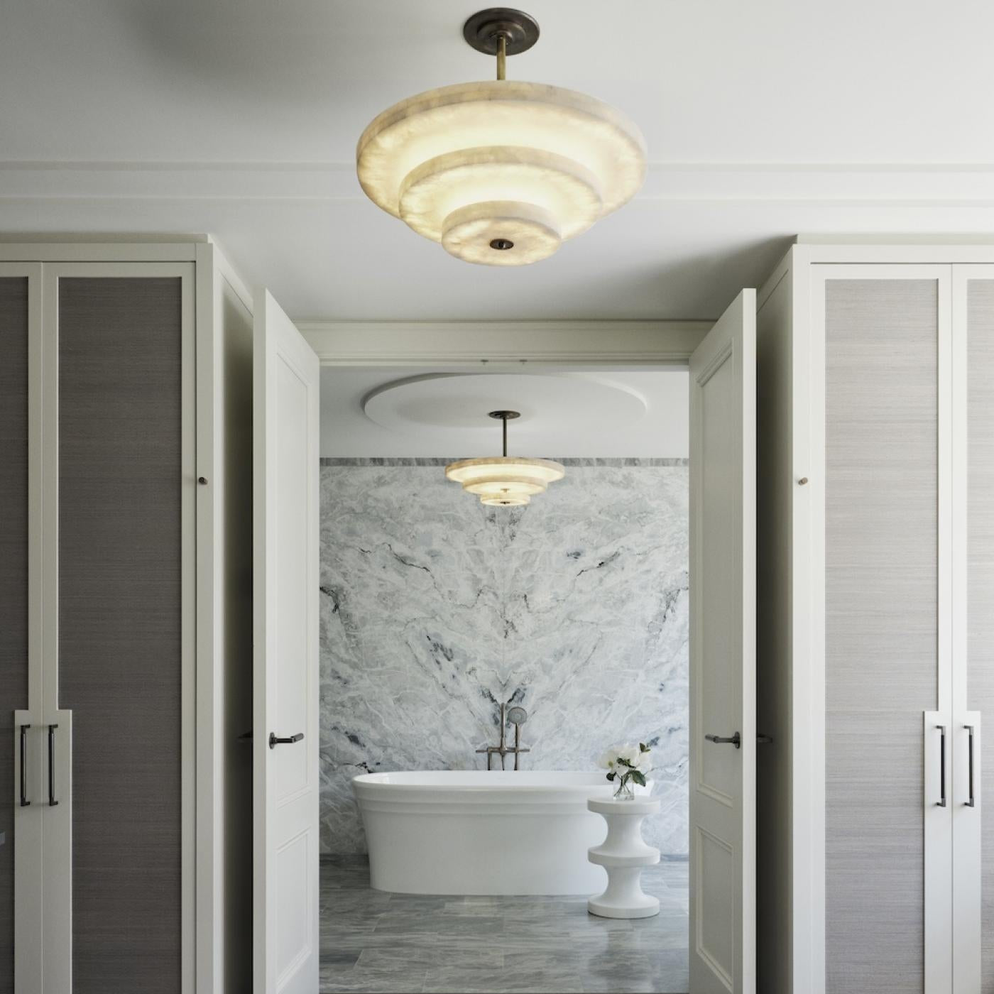 This elegant white onyx pendant light features a unique tiered design with three smooth, onyx layers that softly diffuse the light, creating a warm, inviting atmosphere. Its classic round shape and subtle veining pattern exude sophistication and luxury. The fixture is suspended from brass metal canopy that contrasts beautifully with the light's natural stone.